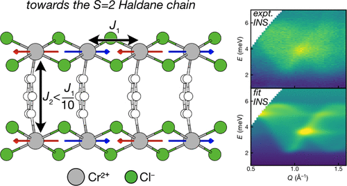Metal–organic magnets (MOMs), modular magnetic materials where metal atoms are connected by organic linkers, are promising candidates for next-generation quantum technologies. MOMs readily form low-dimensional structures and so are ideal systems to realize physical examples of key quantum models, including the Haldane phase, where a topological excitation gap occurs in integer-spin antiferromagnetic (AFM) chains. Thus, far the Haldane phase has only been identified for S = 1, with S ≥ 2 still unrealized because the larger spin imposes more stringent requirements on the magnetic interactions. Here, we report the structure and magnetic properties of CrCl2(pym) (pym = pyrimidine), a new quasi-1D S = 2 AFM MOM. We show, using X-ray and neutron diffraction, bulk property measurements, density-functional theory calculations, and inelastic neutron spectroscopy (INS), that CrCl2(pym) consists of AFM CrCl2 spin chains (J1 = −1.13(4) meV) which are weakly ferromagnetically coupled through bridging pym (J2 = 0.10(2) meV), with easy-axis anisotropy (D = −0.15(3) meV). We find that, although small compared to J1, these additional interactions are sufficient to prevent observation of the Haldane phase in this material. Nevertheless, the proximity to the Haldane phase together with the modularity of MOMs suggests that layered Cr(II) MOMs are a promising family to search for the elusive S = 2 Haldane phase. Full Article