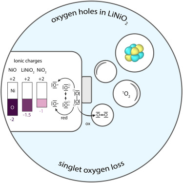 Ni-rich lithium-ion cathode materials achieve both high voltages and capacities but are prone to structural instabilities and oxygen loss. The origin of the instability lies in the pronounced oxidation of O during delithiation: for LiNiO2, NiO2, and the rock salt NiO, density functional theory and dynamical mean-field theory calculations based on maximally localized Wannier functions yield a Ni charge state of ca. +2, with O varying between −2 (NiO), −1.5 (LiNiO2), and −1 (NiO2). Calculated X-ray spectroscopy Ni K and O K-edge spectra agree well with experimental spectra. Using ab initio molecular dynamics simulations, we observe loss of oxygen from the (012) surface of delithiated LiNiO2, two surface O⋅− radicals combining to form a peroxide ion, and the peroxide ion being oxidized to form O2, leaving behind two O vacancies and two O2− ions. Preferential release of 1O2 is dictated via the singlet ground state of the peroxide ion and spin conservation.
