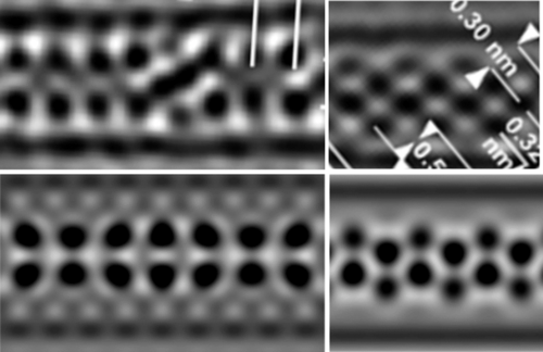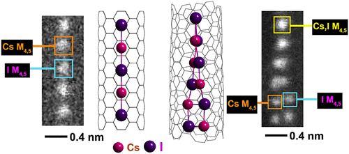 One-dimensional (1D) atomic chains of CsI were previously reported in double-walled carbon nanotubes with ∼0.8 nm inner diameter. Here, we demonstrate that, while 1D CsI chains form within narrow ∼0.73 nm diameter single-walled carbon nanotubes (SWCNTs), wider SWCNT tubules (∼0.8–1.1 nm) promote the formation of helical chains of CsI 2 × 1 atoms in cross-section. These CsI helices create complementary oval distortions in encapsulating SWCNTs with highly strained helices formed from strained Cs2I2 parallelogram units in narrow tubes to lower strain Cs2I2 units in wider tubes. The observed structural changes and charge distribution were analyzed by density-functional theory and Bader analysis. CsI chains also produce conformation-selective changes to the electronic structure and optical properties of the encapsulating tubules. The observed defects are an interesting variation from defects commonly observed in alkali halides as these are normally associated with the Schottky and Frenkel type. The energetics of CsI 2 × 1 helix formation in SWCNTs suggests how these could be controllably formed. Full Article
