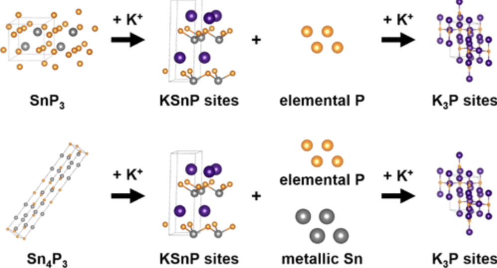 K-ion batteries (KIBs) have the potential to offer a cheaper alternative to Li-ion batteries (LIBs) using widely abundant materials. Conversion/alloying anodes have high theoretical capacities in KIBs, but it is believed that electrode damage from volume expansion and phase segregation by the accommodation of large K-ions leads to capacity loss during electrochemical cycling. To date, the exact phase transformations that occur during potassiation and depotassiation of conversion/alloying anodes are relatively unexplored. In this work, we synthesize two distinct compositions of tin phosphides, Sn4P3 and SnP3, and compare their conversion/alloying mechanisms with solid-state nuclear magnetic resonance (SSNMR) spectroscopy, powder X-ray diffraction (XRD), and density functional theory (DFT) calculations. Ex situ31P and 119Sn SSNMR analyses reveal that while both Sn4P3 and SnP3 exhibit phase separation of elemental P and the formation of KSnP-type environments (which are predicted to be stable based on DFT calculations) during potassiation, only Sn4P3 produces metallic Sn as a byproduct. In both anode materials, K reacts with elemental P to form K-rich compounds containing isolated P sites that resemble K3P but K does not alloy with Sn during potassiation of Sn4P3. During charge, K is only fully removed from the K3P-type structures, suggesting that the formation of ternary regions in the anode and phase separation contribute to capacity loss upon reaction of K with tin phosphides. Full Article