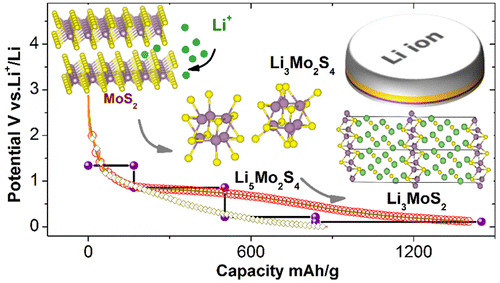 Understanding the structure and phase changes associated with conversion-type materials is key to optimizing their electrochemical performance in Li-ion batteries. For example, molybdenum disulfide (MoS2) offers a capacity up to 3-fold higher (∼1 Ah/g) than the currently used graphite anodes, but they suffer from limited Coulombic efficiency and capacity fading. The lack of insights into the structural dynamics induced by electrochemical conversion of MoS2 still hampers its implementation in high energy-density batteries. Here, by combining ab initio density-functional theory (DFT) simulation with electrochemical analysis, we found new sulfur-enriched intermediates that progressively insulate MoS2 electrodes and cause instability from the first discharge cycle. Because of this, the choice of conductive additives is critical for the battery performance. We investigate the mechanistic role of carbon additive by comparing equal loading of standard Super P carbon powder and carbon nanotubes (CNTs). The latter offer a nearly 2-fold increase in capacity and a 45% reduction in resistance along with Coulombic efficiency of over 90%. These insights into the phase changes during MoS2 conversion reactions and stabilization methods provide new solutions for implementing cost-effective metal sulfide electrodes, including Li–S systems in high energy-density batteries.