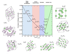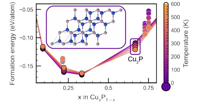 Using first principles structure searching with density-functional theory (DFT) we identify a novel Fm-3m phase of Cu2P and two low-lying metastable structures, an I-43d–Cu3P phase, and a Cm–Cu3P11 phase. The computed pair distribution function of the novel Cm–Cu3P11 phase shows its structural similarity to the experimentally identified Cm–Cu2P7 phase. The relative stability of all Cu–P phases at finite temperatures is determined by calculating the Gibbs free energy using vibrational effects from phonon modes at 0 K. From this, a finite-temperature convex hull is created, on which Fm-3m–Cu2P is dynamically stable and the Cu3−xP (x < 1) defect phase Cmc21–Cu8P3 remains metastable (within 20 meV/atom of the convex hull) across a temperature range from 0 K to 600 K. Both CuP2 and Cu3P exhibit theoretical gravimetric capacities higher than contemporary graphite anodes for Li-ion batteries; the predicted Cu2P phase has a theoretical gravimetric capacity of 508 mAh/g as a Li-ion battery electrode, greater than both Cu3P (363 mAh/g) and graphite (372 mAh/g). Cu2P is also predicted to be both non-magnetic and metallic, which should promote efficient electron transfer in the anode. Cu2P’s favorable properties as a metallic, high-capacity material suggest its use as a future conversion anode for Li-ion batteries; with a volume expansion of 99 % during complete cycling, Cu2P anodes could be more durable than other conversion anodes in the Cu–P system with volume expansions greater than 150 %. The structures and figures presented in this paper, and the code used to generate them, can be interactively explored online using Binder.