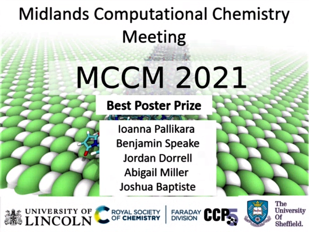 Jordan Dorrell was awarded the Midlands Computational Chemistry Meeting 2021 best poster prize. Jordan presented a poster titled “Machine Learning Random Structure Searching for Li-Ni-S Cathode Discovery”.