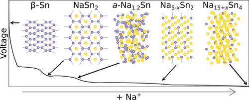 The alloying mechanism of high-capacity tin anodes for sodium-ion batteries is investigated using a combined theoretical and experimental approach. Ab initio random structure searching (AIRSS) and high-throughput screening using a species-swap method provide insights into a range of possible sodium–tin structures. These structures are linked to experiments using both average and local structure probes in the form of operando pair distribution function analysis, X-ray diffraction, and 23Na solid-state nuclear magnetic resonance (ssNMR), along with ex situ 119Sn ssNMR. Through this approach, we propose structures for the previously unidentified crystalline and amorphous intermediates. The first electrochemical process of sodium insertion into tin results in the conversion of crystalline tin into a layered structure consisting of mixed Na/Sn occupancy sites intercalated between planar hexagonal layers of Sn atoms (approximate stoichiometry NaSn3). Following this, NaSn2, which is predicted to be thermodynamically stable by AIRSS, forms; this contains hexagonal layers closely related to NaSn3, but has no tin atoms between the layers. NaSn2 is broken down into an amorphous phase of approximate composition Na1.2Sn. Reverse Monte Carlo refinements of an ab initio molecular dynamics model of this phase show that the predominant tin connectivity is chains. Further reaction with sodium results in the formation of structures containing Sn–Sn dumbbells, which interconvert through a solid-solution mechanism. These structures are based upon Na5–xSn2, with increasing occupancy of one of its sodium sites commensurate with the amount of sodium added. ssNMR results indicate that the final product, Na15Sn4, can store additional sodium atoms as an off-stoichiometry compound (Na15+xSn4) in a manner similar to Li15Si4.