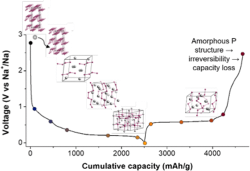 Na-ion batteries are promising alternatives to Li-ion systems for electrochemical energy storage because of the higher natural abundance and widespread distribution of Na compared to Li. High capacity anode materials, such as phosphorus, have been explored to realize Na-ion battery technologies that offer comparable performances to their Li-ion counterparts. While P anodes provide unparalleled capacities, the mechanism of sodiation and desodiation is not well-understood, limiting further optimization. Here, we use a combined experimental and theoretical approach to provide molecular-level insight into the (de)sodiation pathways in black P anodes for sodium-ion batteries. A determination of the P binding in these materials was achieved by comparing to structure models created via species swapping, ab initio random structure searching, and a genetic algorithm. During sodiation, analysis of 31P chemical shift anisotropies in NMR data reveals P helices and P at the end of chains as the primary structural components in amorphous NaxP phases. X-ray diffraction data in conjunction with variable field 23Na magic-angle spinning NMR support the formation of a new Na3P crystal structure (predicted using density-functional theory) on sodiation. During desodiation, P helices are re-formed in the amorphous intermediates, albeit with increased disorder, yet emphasizing the pervasive nature of this motif. The pristine material is not re-formed at the end of desodiation and may be linked to the irreversibility observed in the Na–P system.