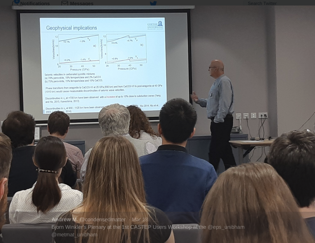 The first CASTEP Users Meeting was held this week in Birmingham, and organised by Andrew and Phil Hasnip. The meeting was a success, with speakers travelling from as far as Taiwan to attend the workshop. At the meeting, one of the Morris group PhD students, Angela Harper, took home the first place poster prize for her work on “Electronic Structure and Properties of Transition Metal Phosphides”. Featured in the image here is Bjoern Winkler from Goethe University, Frnakfurt, Germany, giving the first talk of the workshop on “Understanding phase transitions using CASTEP”. Andrew, and the rest of the CASTEP community are looking forward to hosting more workshops such as this one in the coming years, to make this an annual occurance. This is in addition to the CASTEP Workshop held each year in August for new users and CASTEP developers.