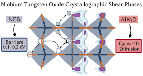 Niobium tungsten oxides with crystallographic shear structures form a promising class of high-rate Li-ion anode materials. Lithium diffusion within these materials is studied in this work using density functional theory calculations, specifically nudged elastic band calculations and ab initio molecular dynamics simulations. Lithium diffusion is found to occur through jumps between 4-fold coordinated window sites with low activation barriers (80–300 meV) and is constrained to be effectively one-dimensional by the crystallographic shear planes of the structures. We identify a number of other processes, including rattling motions with barriers on the order of the thermal energy at room temperature, and intermediate barrier hops between 4-fold and 5-fold coordinated lithium sites. We demonstrate differences regarding diffusion pathways between different cavity types; within the ReO3-like block units of the structures, cavities at the corners and edges host more isolated diffusion tunnels than those in the interior. Diffusion coefficients are found to be in the range of 10–12 to 10–11 m2 s–1 for lithium concentrations of 0.5 Li/TM. Overall, the results provide a complete picture of the diffusion mechanism in niobium tungsten oxide shear structures, and the structure–property relationships identified in this work can be generalized to the entire family of crystallographic shear phases.