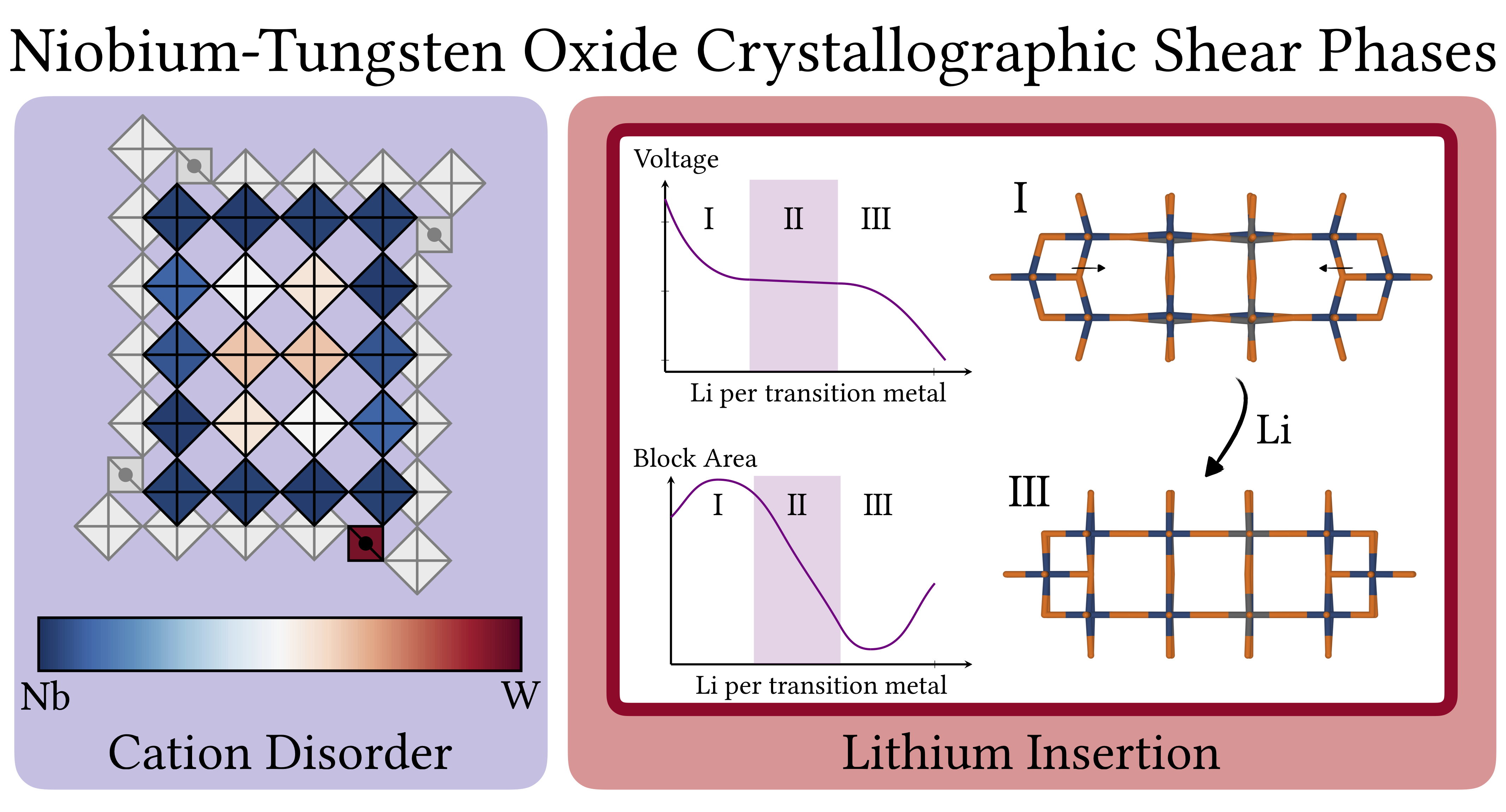 Wadsley–Roth crystallographic shear phases form a family of compounds that have attracted attention due to their excellent performance as lithium-ion battery electrodes. The complex crystallographic structure of these materials poses a challenge for first-principles computational modeling and hinders the understanding of their structural, electronic and dynamic properties. In this article, we study three different niobium–tungsten oxide crystallographic shear phases (Nb12WO33, Nb14W3O44, Nb16W5O55) using an enumeration-based approach and first-principles density-functional theory calculations. We report common principles governing the cation disorder, lithium insertion mechanism, and electronic structure of these materials. Tungsten preferentially occupies tetrahedral and block-central sites within the block-type crystal structures, and the local structure of the materials depends on the cation configuration. The lithium insertion proceeds via a three-step mechanism, associated with an anisotropic evolution of the host lattice. Our calculations reveal an important connection between long-range and local structural changes: in the second step of the mechanism, the removal of local structural distortions leads to the contraction of the lattice along specific crystallographic directions, buffering the volume expansion of the material. Niobium–tungsten oxide shear structures host small amounts of localized electrons during initial lithium insertion due to the confining effect of the blocks, but quickly become metallic upon further lithiation. We argue that the combination of local, long-range, and electronic structural evolution over the course of lithiation is beneficial to the performance of these materials as battery electrodes. The mechanistic principles we establish arise from the compound-independent crystallographic shear structure and are therefore likely to apply to niobium–titanium oxide or pure niobium oxide crystallographic shear phases.