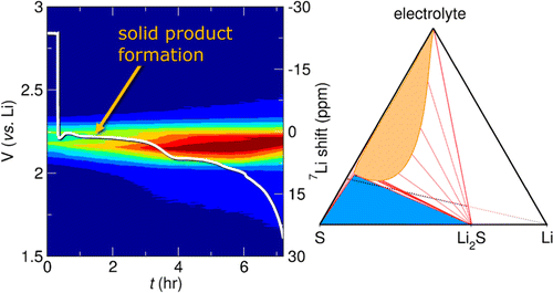 The high theoretical gravimetric capacity of the Li-S battery system makes it an attractive candidate for numerous energy storage applications. In practice, cell performance is plagued by low practical capacity and poor cycling. In an effort to explore the mechanism of the discharge with the goal of better understanding performance, we examine the Li-S phase diagram using computational techniques and complement this with an in situ 7 Li NMR study of the cell during discharge. Ab Initio Structure Search and in Situ 7Li NMR Studies of Discharge Products in the Li-S Battery System