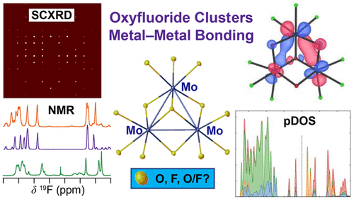 Complex crystal structures with subtle atomic-scale details are now routinely solved using complementary tools such as X-ray and/or neutron scattering combined with electron diffraction and imaging. Identifying unambiguous atomic models for oxyfluorides, needed for materials design and structure–property control, is often still a considerable challenge despite their advantageous optical responses and applications in energy storage systems. In this work, NMR crystallography and single-crystal X-ray diffraction are combined for the complete structure solution of three new compounds featuring a rare triangular early transition metal oxyfluoride cluster, [Mo3O4F9]5–. After framework identification by single-crystal X-ray diffraction, 1D and 2D solid-state 19F NMR spectroscopy supported by ab initio calculations are used to solve the structures of K5[Mo3O4F9]·3H2O (1), K5[Mo3O4F9]·2H2O (2), and K16[Mo3O4F9]2[TiF6]3·2H2O (3) and to assign the nine distinct fluorine sites in the oxyfluoride clusters. Furthermore, 19F NMR identifies selective fluorine dynamics in K16[Mo3O4F9]2[TiF6]3·2H2O. These dual scattering and spectroscopy methods are used to demonstrate the generality and sensitivity of 19F shielding to small changes in bond length, on the order of 0.01 Å or less, even in the presence of hydrogen bonding, metal–metal bonding, and electrostatic interactions. Starting from the structure models, the nature of chemical bonding in the molybdates is explained by molecular orbital theory and electronic structure calculations. The average Mo–Mo distance of 2.505 Å and diamagnetism in 1, 2, and 3 are attributed to a metal–metal bond order of unity along with a 1a21e4 electronic ground state configuration for the [Mo3O4F9]5− cluster, leading to a rare trimeric spin singlet involving d2 Mo4+ ions. The approach to structure solution and bonding analysis is a powerful strategy for understanding the structures and chemical properties of complex fluorides and oxyfluorides.