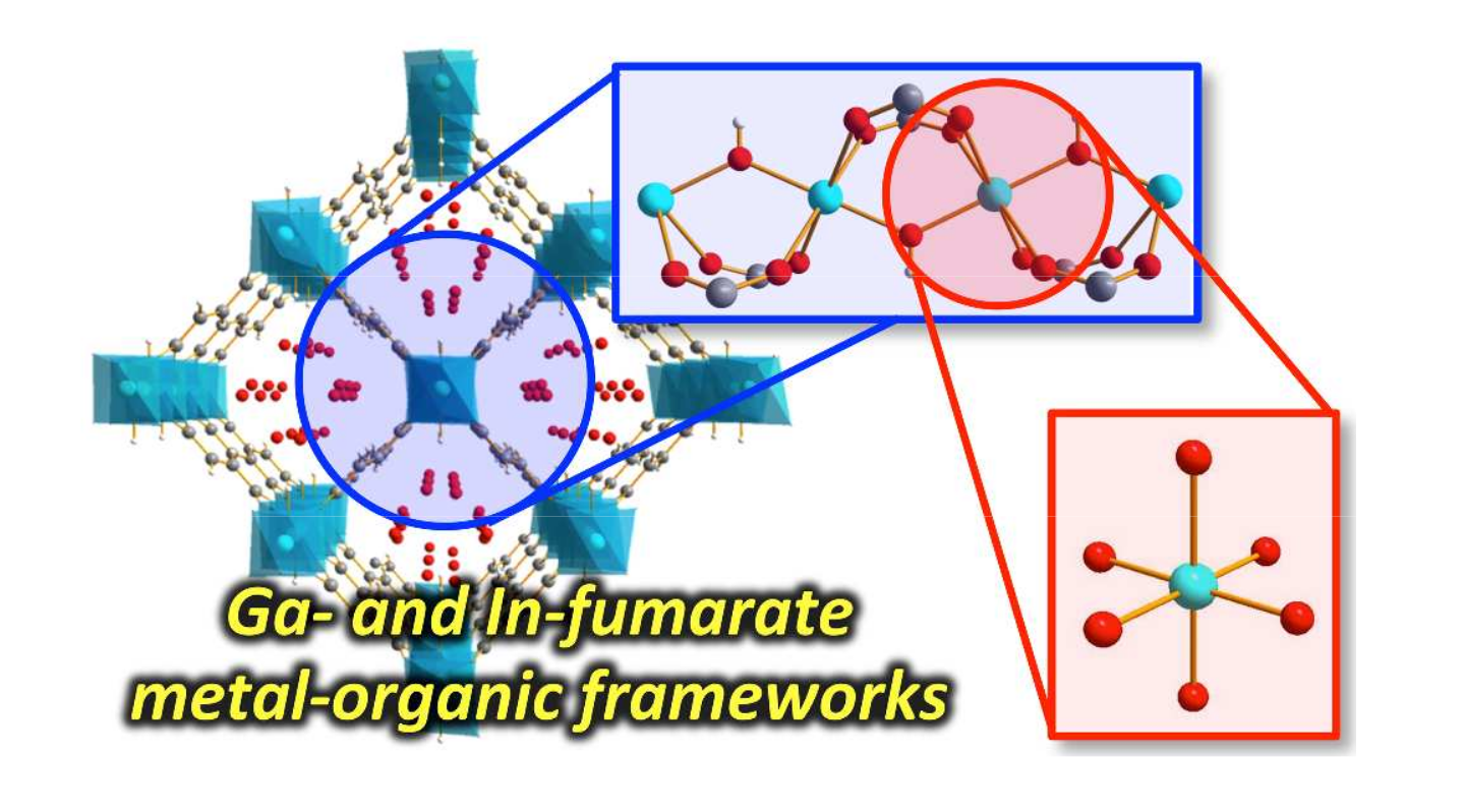 The properties and applications of metal-organic frameworks (MOFs) are strongly dependent on the nature of the metals and linkers employed, along with the specific conditions employed during synthesis. Al-fumarate, trademarked as Basolite A520, is a porous MOF that incorporates aluminum centers along with fumarate linkers, and is a promising material for applications involving adsorption of gases such as CO2. In this work, the solvothermal synthesis and detailed characterization of the gallium and indium fumarate MOFs (Ga-fumarate, In-fumarate) are described. Using a combination of powder X-ray diffraction, Rietveld refinements, solid-state NMR spectroscopy, infrared spectroscopy, and thermogravimetric analysis, the topologies of Ga-fumarate and In-fumarate are revealed to be analogous to Al-fumarate. Ultra-wideline 69Ga, 71Ga and 115In NMR experiments at 21.1 T strongly support our refined structure. Adsorption isotherms show that the Al-, Ga-, and In-fumarate MOFs all exhibit an affinity for CO2, with Al-fumarate the superior adsorbent at 1 bar and 273 K. Static direct excitation and cross-polarized 13C NMR experiments permit investigation of CO2 adsorption locations, binding strengths, motional rates, and motional angles that are critical to increasing adsorption capacity and selectivity in these materials. Conducting the synthesis of the indium-based framework in methanol demonstrates a simple route to introduce porous hydrophobicity into a MIL-53-type framework, by incorporation of metal-bridging –OCH3 groups in the MOF pores.
