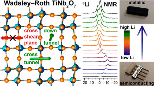 TiNb2O7 is a Wadsley–Roth phase with a crystallographic shear structure and is a promising candidate for high-rate lithium ion energy storage. The fundamental aspects of the lithium insertion mechanism and conduction in TiNb2O7, however, are not well-characterized. Herein, experimental and computational insights are combined to understand the inherent properties of bulk TiNb2O7. The results show an increase in electronic conductivity of seven orders of magnitude upon lithiation and indicate that electrons exhibit both localized and delocalized character, with a maximum Curie constant and Li NMR paramagnetic shift near a composition of Li0.60TiNb2O7. Square-planar or distorted-five-coordinate lithium sites are calculated to invert between thermodynamic minima or transition states. Lithium diffusion in the single-redox region (i.e., x ≤ 3 in LixTiNb2O7) is rapid with low activation barriers from NMR and DLi = 10–11 m2 s–1 at the temperature of the observed T1 minima of 525–650 K for x ≥ 0.75. DFT calculations predict that ionic diffusion, like electronic conduction, is anisotropic with activation barriers for lithium hopping of 100–200 meV down the tunnels but ca. 700–1000 meV across the blocks. Lithium mobility is hindered in the multiredox region (i.e., x > 3 in LixTiNb2O7), related to a transition from interstitial-mediated to vacancy-mediated diffusion. Overall, lithium insertion leads to effective n-type self-doping of TiNb2O7 and high-rate conduction, while ionic motion is eventually hindered at high lithiation. Transition-state searching with beyond Li chemistries (Na+, K+, Mg2+) in TiNb2O7 reveals high diffusion barriers of 1–3 eV, indicating that this structure is specifically suited to Li+ mobility.