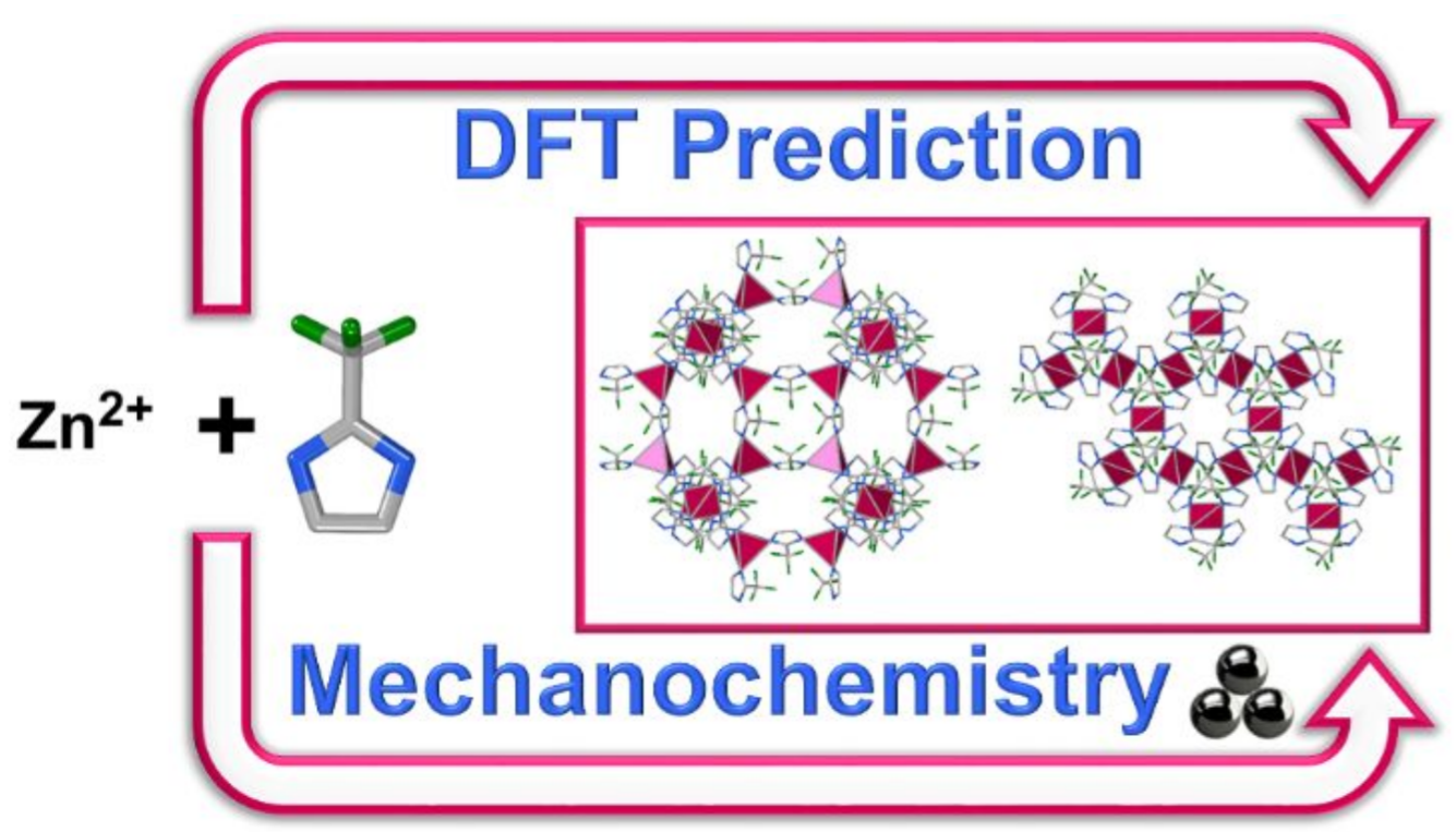 Abstract: The prediction of topological preferences and polymorph stability remains a challenge for the design of metal-organic frameworks (MOFs) exhibiting a rich topological landscape, such as zeolitic imidazolate frameworks (ZIFs). Here, we have used mechanochemical screening and calorimetry to test the ability of dispersion-corrected periodic density functional theory (DFT) to accurately survey the topological landscape, as well as quantitatively evaluate polymorph stability, for a previously not synthesized ZIF composition. Theoretical calculations were used to obtain an energy ranking and evaluate energy differences for a set of hypothetical, topologically-distinct structures of a fluorine-substituted ZIF. Calculations were then experimentally validated via mechanochemical screening and calorimetry which confirmed two out of three theoretically anticipated topologies, including a fluorinated analogue of the popular ZIF-8, while revealing an excellent match between the measured and theoretically calculated energetic difference between them. The results, which speak strongly in favor of ability of dispersion-corrected periodic DFT to predict the topological landscape of new ZIFs, also reveal the ability to use peripheral substituents on the organic linker to modify the framework thermodynamic stability.